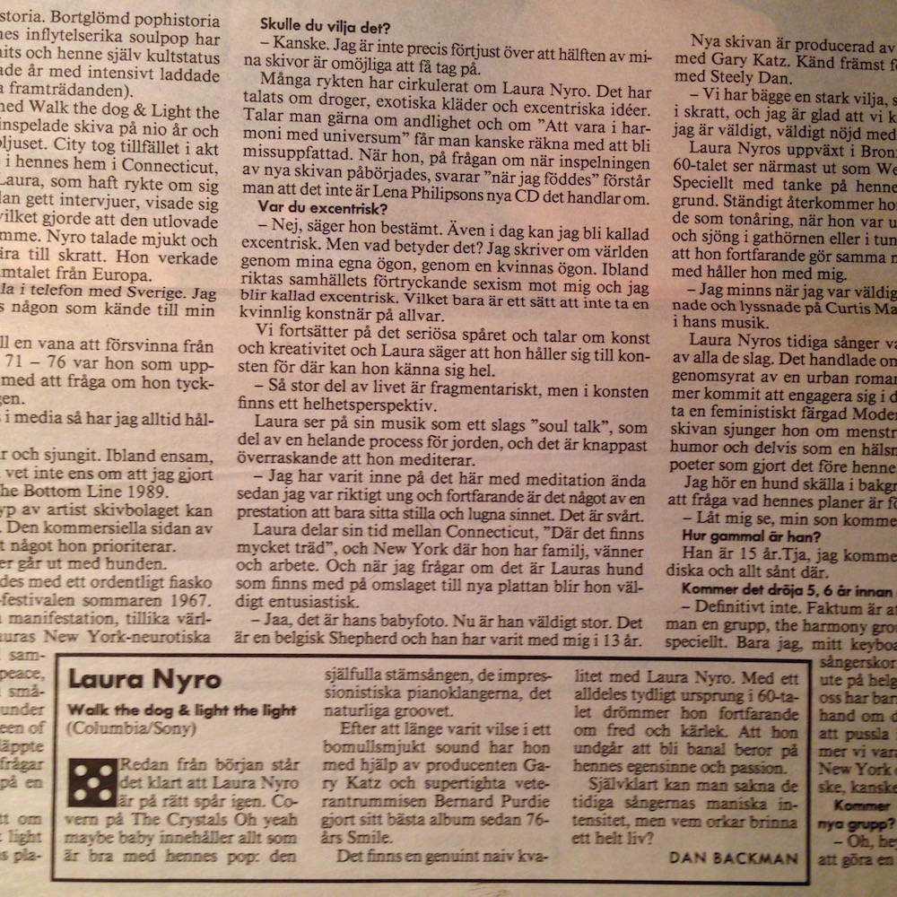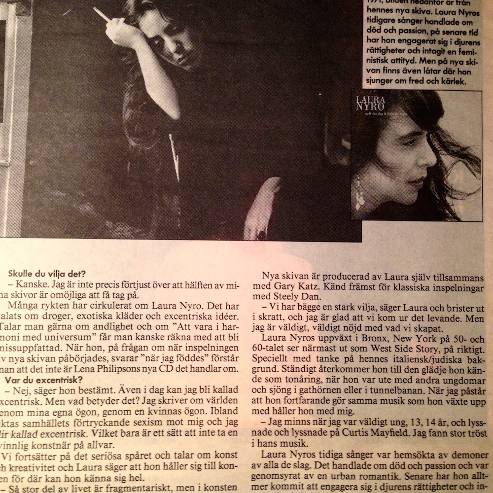Nedanstående intervju med Laura Nyro – som jag antar är den enda som gjorts av en svensk journalist – genomfördes per telefon 20 oktober 1993 (Stockholm-Danbury, Connecticut). Intervjun gjordes med anledning av hennes då aktuella album Walk the dog & light the light.