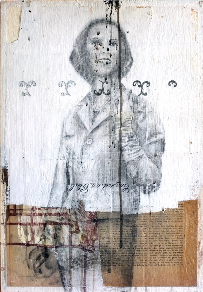 Utan titel (akryl/tidning/foto på pannå, 49×34)
