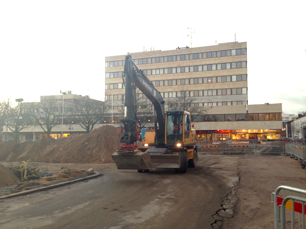 När jag på väg hem tar en sväng genom Ljungby med bilen ser jag att Sven Ljungbergs älskade torg är under omgörning igen. Det känns helt naturligt för den som likt mig själv lärt känna den lilla staden via Ljungbergs bilder. Med en gul grävskopa, gulröda avspärrningar och i fonden hotellet – som idag kan uppfattas som rätt snyggt i sin postfunktionalistiska klossighet – ser det ju ut som en uppdaterad Sven Ljungberg-målning från ett Bingolotto-Sverige där det alltid är vardag.
