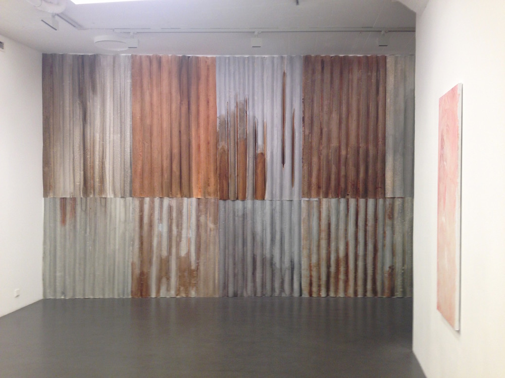 Akvarell i stort format, men inga collage, hittar man på Galleri Flach. Gabriela Spilsbury har hängt (eller ska vi säga spikat) upp akvareller i monumentalformat som skapar en illusion av korrugerad plåt. Även här är det (naturligtvis) svårt att inte referera till giganten Lars Lerin.