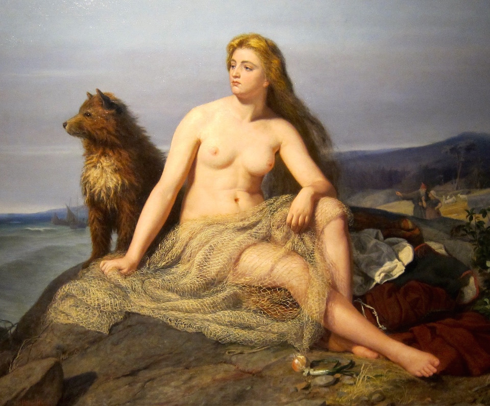 Mårten Eskil Winges ”Kraka” är en annan märklig höjdpunkt. I förgrunden den fornnordiska prinsessan Kraka, med underkroppen skyld av ett fisknät. Framför henne en lök, bredvid en hög med kläder och en gulligt ullig hund. Båda blickande ut mot ett upprört hav. En bit bakom, och här är måleriet lite slarvigt, syns ett par inbegripna i en livlig diskussion. Mannen, i röd mössa, pekar ut mot havet. Ännu en bit bort syns några getter.