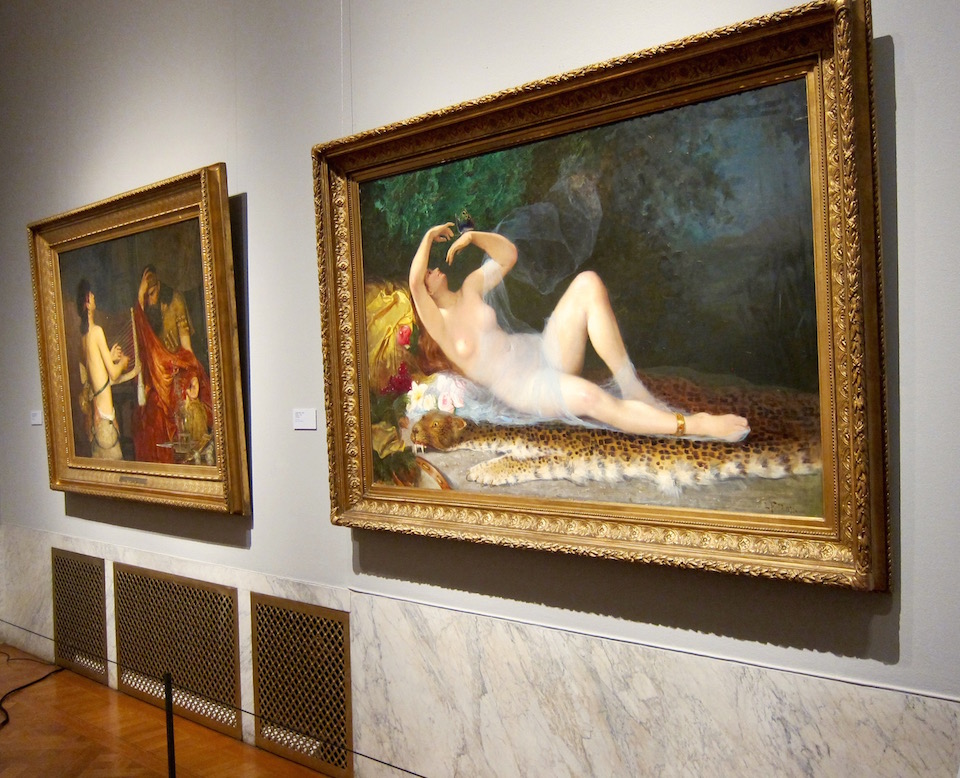 Så, vad är det som visas? Tja, här finns påfallande många nakna kvinnor, lättjefullt utsträckta på divaner och djurfällar och gärna flankerade av barnänglar. Många av motiven är litterära, mytologiska eller hämtade ur Bibeln, genomgående med ett exotiserande, erotiserande och eskapistiskt drag. Idag skulle man kunna säga att kvinnokroppen är objektifierad och att utblicken mot världen är etnocentrisk, men då så mycket svepts in i ett bokmärkesliknande översockrat sagoskimmer, med mängder av puttis, keruber och amoriner, blir det stundtals svårt att ta det riktigt på allvar.