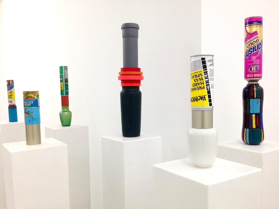 Florian Slotawa jobbar också med reduktion och repetition. Den tyska konstnären är friare i sitt uttryck än Per Kesselmar men hans strängt komponerade skulpturer kan ändå sägas ha ett minimalistiskt drag bakom sitt delvis färgglada yttre.