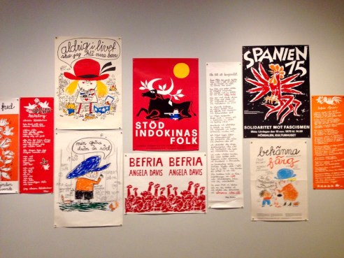 Thielska-retrospektiven är konventionell med start i studietiden på slutet av 1930-talet och tematiskt uppdelad i de små rummen. I ett av dem finns en vägg med politiska affischer av bästa sort: ”Stöd Indokinas folk”, ”Befria Angela Davis”, ”Solidaritet mot fascismen”. I ett annat skisser och modeller till tunnelbanestationen i Tensta och skulpturen ”Dafne” i Södertälje (olyckligt inklämd i Lunagallerian).