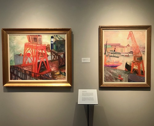 Motiven är delvis samma men måleriet har kommit in i en ny fas. Nu finns det en orolig kraft i vyerna över Stadsgårdens kajer och fartyg. Lyftkranarna har blivit större, intensivt röda och har flyttat fram till förgrunden. Det är som att hon ser på världen med en annan, mer djärv, blick efter tiden på Konradsbergs sjukhus.