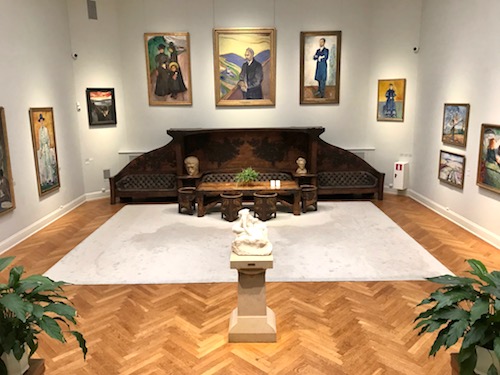 I samma rum finns också, vid sidan av symbolistiskt laddade målningar, fem av Fjaestads märkliga stabbestolar. Snidade av stubbar och lika fornnordiskt tunga som jugendslingriga landar de i ett fantastiskt uttryck mellan möbel och skulptur.