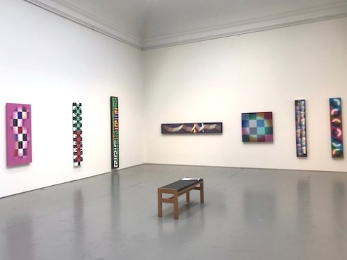 Jag har svårt för det långsmala formatet och sedda på håll är bilderna grälla och banala, mer dekoration än konst. Går man nära och fokuserar på utsnitt av målningarna är de fantastiskt vackra. Då förvandlas måleriet till en uppdaterad pop-variant av konkretismen.