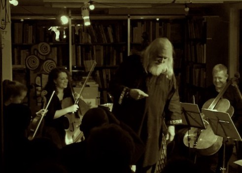 Moondogs lärjunge och musikaliska arvtagare Stefan Lakatos, som med sitt vita långa hår och skägg alltmer framstår som en inkarnation av Moondog (för att inte tala om hur lik han är Robert Wyatt), sitter på golvet framför den stråkkvintett som döpts till The Original Moondog Strings (två altfioler, två celli och en kontrabas). Han är en mästare på den originella uppsättningen slagverk som bara är Moondogs och jordar genom sitt spel stråkarnas något mer lättflyktiga karaktär.