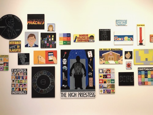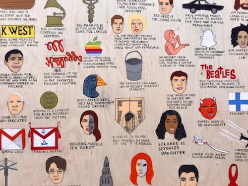 En bild av en mobil och ett radband går under titeln ”Devotional objects”, en annan visar ”famous jobs lost to automation”. På den stora målningen ”Famous conspiracy theories part 4” upplyses det till exempel om att Stevie Wonder inte är blind, att Meghan Markle är en robot och att rödhårigas DNA är av utomjordiskt ursprung.