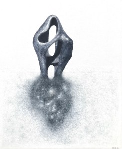 Skulptur i lera på en avsågad trädstam (olja på pannå, 24×33)