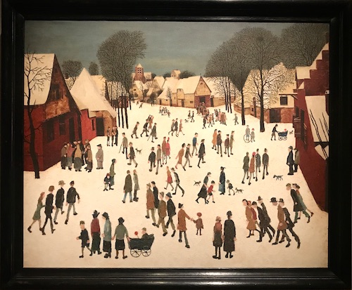 Den bästa är en fin liten målning i lätt naivistisk stil, där hon målat in den brittiska konstnären L.S. Lowrys karaktäristiska figurer i en av Pieter Bruegel den äldres vinterbilder (som i sitt original skildrar en blodig massaker). Den hänger undanskymd i ett litet rum men är mångfalt intressantare – då den verkligen kommunicerar genom århundradena – än de kitschiga verk som också går att finna. Hårda ord, jag vet, men Freddy Fabris, Matt Collishaw och Rob & Nick Carters ytliga parafraser – för att ta tre uppenbara exempel – håller faktiskt inte måttet.