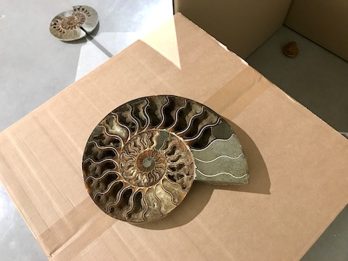 Här finns också olika objekt, som alla skulle kunna vara hämtade från ett naturhistoriskt museum av den gamla fina sorten. Bland annat fantastiskt vackra delade ammoniter (fossil av en utdöd underklass av bläckfiskar som levde för sisådär 400 till 65 miljoner år sedan), Swarovski-kristaller och en anatomisk modell av ett öra. Den gemensamma nämnaren är den spiralform som ligger till grund för det som kallas ”gyllene snittet” och som i matematikens värld motsvaras av Fibonaccis berömda talföljd.