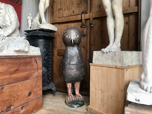 Längst in i det mindre rektangulära rummet, verkstadsateljén, hittar man en ugglefågel. Den är brun och smälter nästan ihop med den bruna dörren bakom. Också den tycks vilja gömma sig och ser genuint förvånad ut när våra blickar möts.