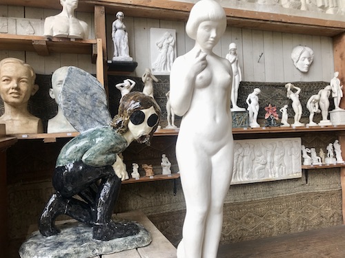 Pojkflickan, som också är en insekt och som lömskt gömmer sig bakom en annan liljevit introvert flicka, ger helt andra känslor. Skulpterad som en fluga – eller någon annan insekt med vingar, stora svarta ögon och en sugpropp till mun – känns hon mer hotfull än rörande. Placeringen är helt genial, det blir till ett litet drama.