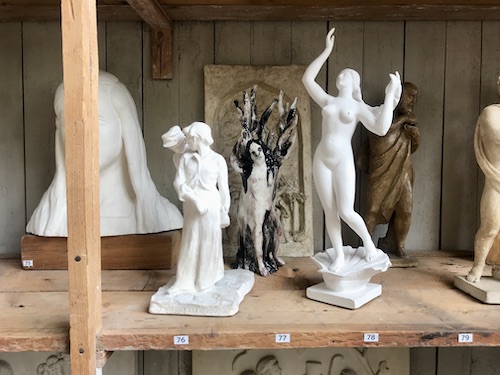 Placerad i en hylla full av små förlagor till skulpturer försöker hon efterlikna den i en snäcka stående liljevita Venus-kvinna som graciöst sträcker upp sina armar.