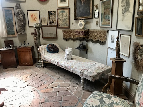 Måste också nämna den lilla gulliga hunden som sitter i sängen i den med möbler och konstverk belamrade Rotundan. Hur självklar är inte den placeringen? Här hänger också en röd mun, det ser ut som ett popkonstverk. Munnen återkommer på en textilapplikation som, trots att det anspelar på Konstnärsförbundets gamla fana som hänger i ett av rummen, känns malplacerat.