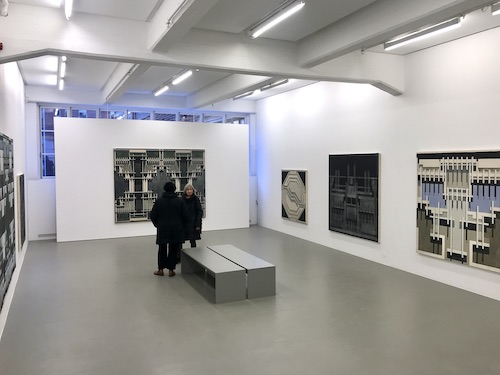Precis som förr är det ett måleri som både kan ses som konkret abstrakt och som avbildningar av arkitektur hämtad från mörka science fiction-berättelser. Ibland finner man sig stående framför en lite skrämmande auktoritär husfasad, ibland blickar man ner, som en ovälkommen drönare, mot en labyrintisk konstruktion.
