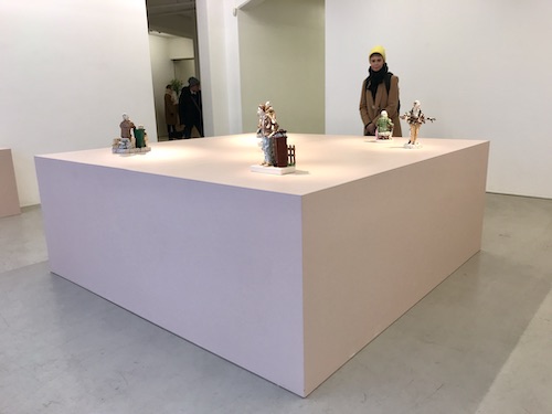 Utställningen på Cecilia Hillström är hans första men figurinerna känns igen. Då som nu är de konstfullt arrangerade på en gemensam yta. Denna gång en kub vars puderrosa nyans harmonierar med figurinernas glaserade och målade färger.