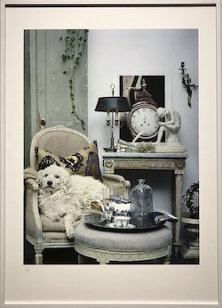 Trots att en jurymedlem, Julia Peirone, är fotograf är det tunnsått med fotografier på utställningen. Av de som ändå finns lite här och där fastnar jag särskilt för ett med titeln ”Borglighetens hundliv”, föreställande en liten lurvig vit hund, lojt liggande i en stol. Det är egentligen ingen märkvärdig bild – signerad Thomas Hjertén och Gisela Montán – men färgskalan är vackert nedtonad och den närmast förmänskligade hunden naglar fast mig med sin melankoliska blick.