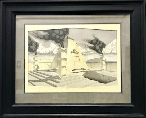 Ernst Christian Efvergrens ”Förslag till imaginär byggnad nr 23” är helt egen och till synes utan koppling till samtiden. En arkitektonisk fantasi i grått, vitt, svart och blekgult. Tecknad med blyerts, färglagd med tusch och med en konstfullt tung inramning. Motivet är möjligen ett aztekiskt tempel, med svart rök vällande ur fyra skorstenar, målat som ett joint venture av Giorgio de Chirico och Sten Eklund.