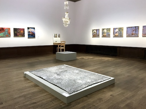 I ett av de mindre rummen ser jag tre verk som bildar en diagonal: en matta i aluminium, en skev kristallkrona samt ett arrangemang med en stol och ett asketiskt dukat bord, som med en spegel ser ut att gå igenom väggen. Först tror jag att det är samma konstnär då de tycks bilda en liten surrealistisk berättelse i hemmiljö. I själva verket är mattan och kristallkronan gjord av Hannah Brännström och bordsarrangemanget av Frida Foberg. Tre verk som destabiliserar vardagen på ett spännande sätt.