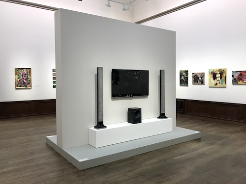 Det finns mycket bra att hitta på golvet också. Både renodlade skulpturer och sådant som mer är att betrakta som installationer. Det allra märkligaste verket är skapat av Enrico Gualersi och bär titeln ”Low-Fi system”. Vad som först ser ut som en riktig platt-tv, upphängd på en grå vägg och flankerad av två smala högtalare med en baslåda mellan, visar sig vid närmare inspektion vara gjord av, som det står, ”solid svart marmor med olika ytbehandlingar”. Ett imponerande hantverk och en säker estetik med drag av gravmonument och Ulrik Samuelson.