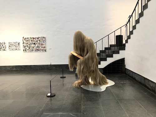 Lena Trapps av långt böljande hår täckta figur kan jag ju förstås inte motstå. Den vill man klappa (får man inte) och instagramma (får man). Den ser ut som en korsning mellan en afghanhund, Chewbacca och yetin, snömannen från Tibet, och frambär en träplanka. Som vore det en offergåva.