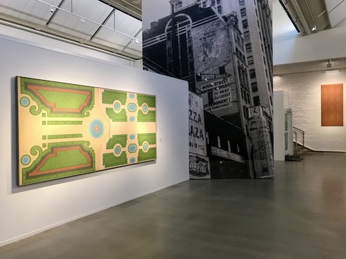 Att se den konstnärligt gestaltade planritningen av Drottningholmsparken hängd horisontalt blir en smärre chock. Ingående i Moderna Museets samling har jag vant mig vid att se den fantastiska målningen vertikalt hängd men, som jag uppmärksammas på, Östhlin har signerat den så att båda hängningarna blir möjliga.