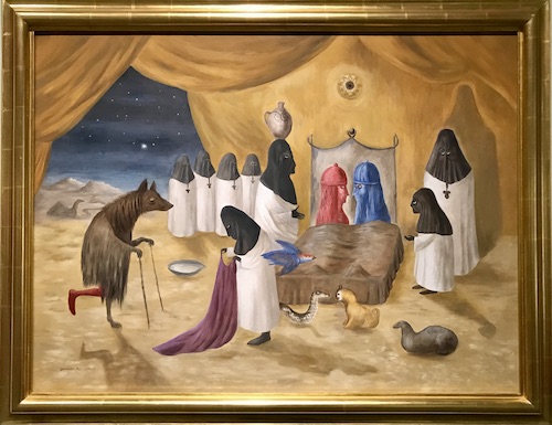 Den lilla och vackert målade temperamålningen ”The Magdalens”, från 1986, är ett fint exempel på detta. I förgrunden två kvinnliga figurer, vars hår täcker hela kroppen, placerade i ett arkaiskt torrt landskap med grottor och en bäck. I bakgrunden en mor med någon slags vit niqab och två barn. Den äldre hårkvinnan ger den yngre ett piller. Jag läser mig till att det, enligt feministen Carrington, ska vara ett p-piller. Det är en mångfacetterad bild: sagolik, gåtfull, politisk och rolig.