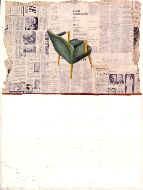 Den gröna stolen. Akryl/tidningspapper på pannå, 50×66, 1992.