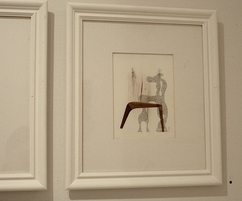 Modernistisk skulptur i utställningsrum med väggmålning, apelsin och Märta Måås-Fjetterström-matta (detalj). Olja på pannå, 2011-2012.