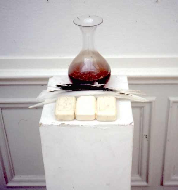 Installation med vin, fjädrar, tvålar, Konsthögskolan, 1976.